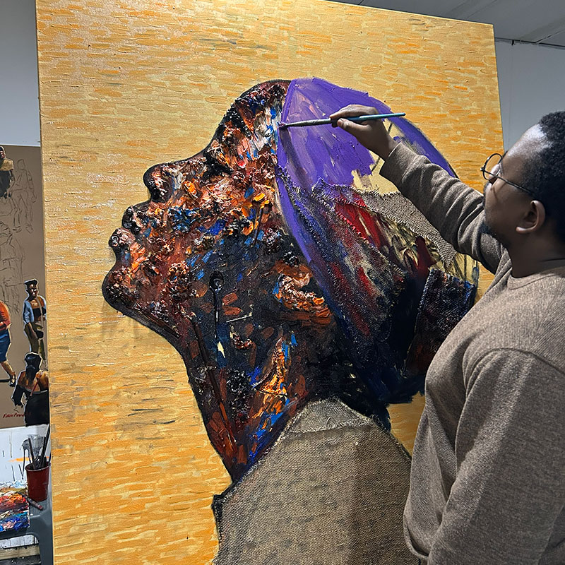 Assan Taylor is a self-taught artist known for vibrant, textured portraits that blend traditional and contemporary techniques. Using charcoal, oil and acrylic paint, newspaper print, gold leaf and netting, he explores identity, culture, and human connection. Born in Southern Africa and now based at Ellis House Art Building, his bold, expressive style aims to inspire empathy and connection while pushing the boundaries of contemporary art.